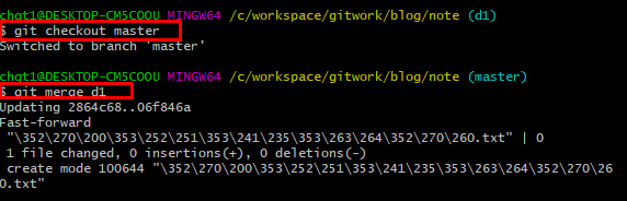 git merge 브랜치 이름 -> 다른 브랜치를 현재 Checkout된 브랜치에 Merge 하는 명령