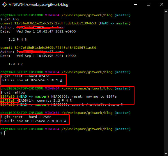 git reflog -> 내가 커밋한것 모두 조회